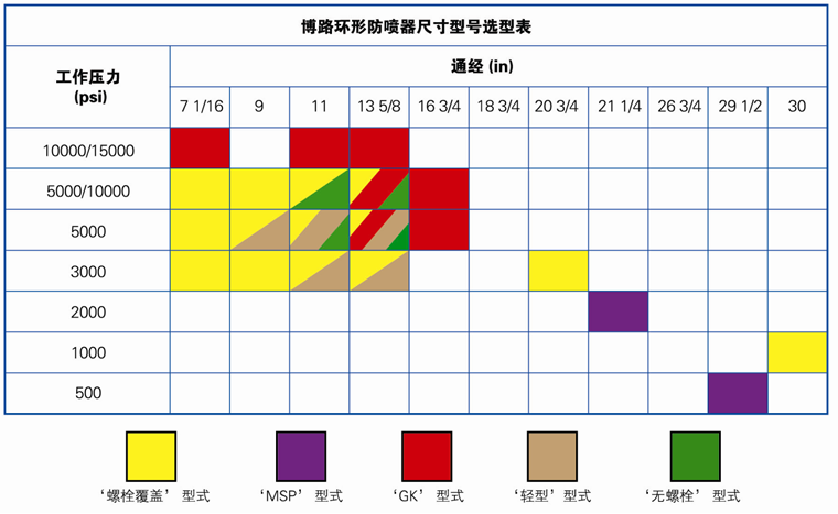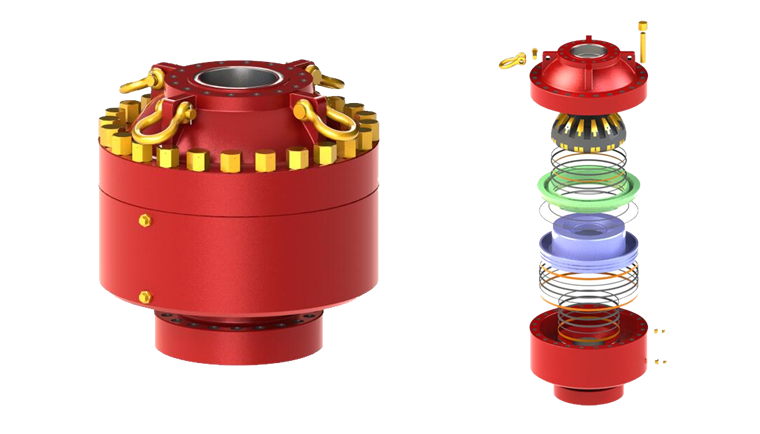 装备有球型胶芯的环形防喷器结构简单,胶芯封零效果好,使用寿命长,与锥形胶芯环形防喷器相比较,从外形看,径向尺寸偏大,高度稍低。